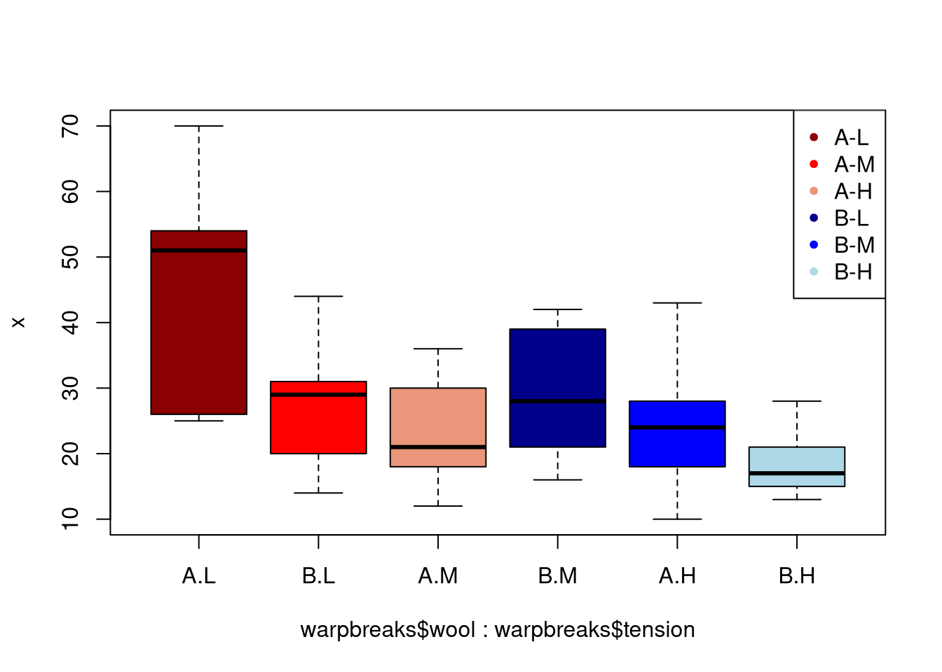boxplot(x ~ warpbreaks$wool + warpbreaks$tension, col = group.cols)