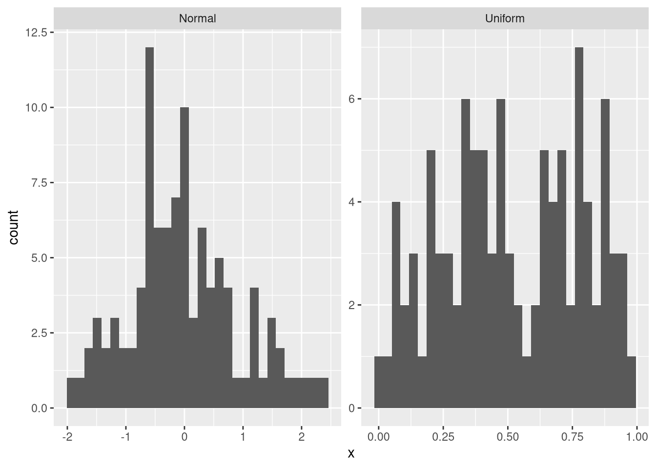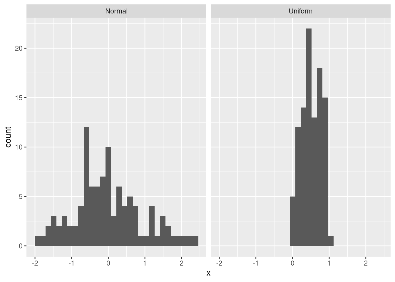 One problem with the facet problem is that the scales may be different for the two axes. For example, the data from the normal distribution have a smaller maximum frequency than those from the uniform distribution. Thus, values from the normal distribution are not clearly visible. Moreover, the uniform data are in a smaller value range than the normal data. To fix this problem, we can provide an additional argument that makes both the x-axis and the y-axis flexible: