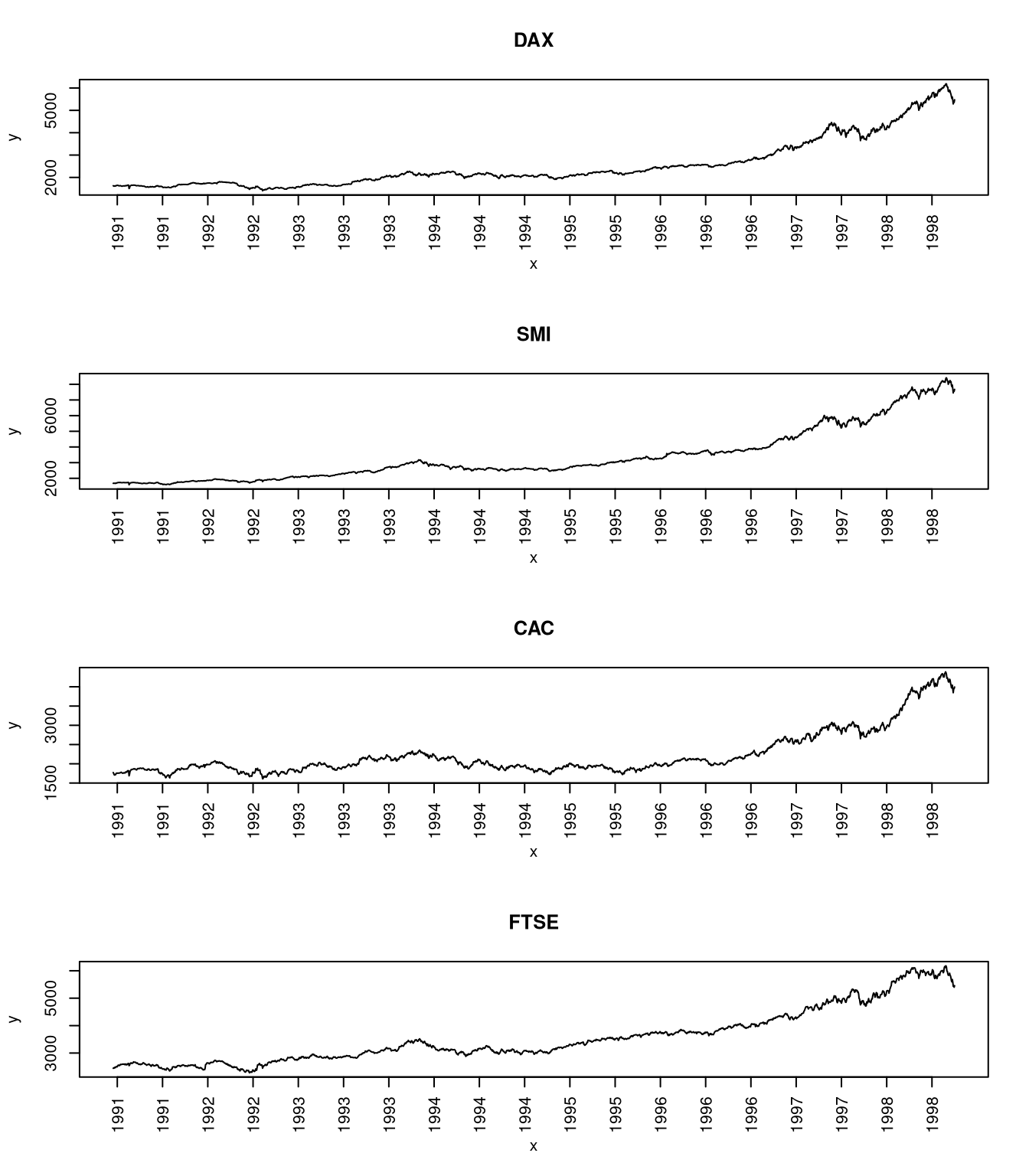 The EuStockMarkets data set contains the daily closing prices (except for weekends/holidays) of four European stock exchanges: the DAX (Germany), the SMI (Switzerland), the CAC (France), and the FTSE (UK). An important characteristic of these data is that they represent stock market points, which have different interpretations depending on the exchange. Thus, one should not compare points between different exchanges.