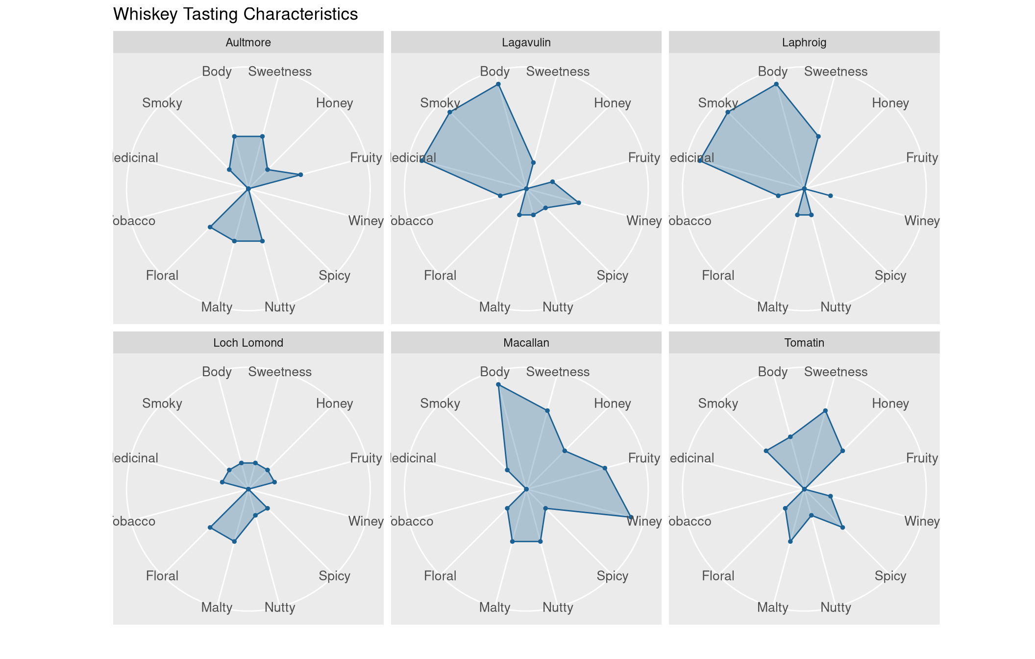 For example, whiskeys from Islay are characterized by their smokiness and their medicinal taste, which is a result of excessive use of peat during the malting process. As a consequence, whiskeys from the Laphroig and and Lagavulin distilleries have similarly radar profiles for these characteristics.