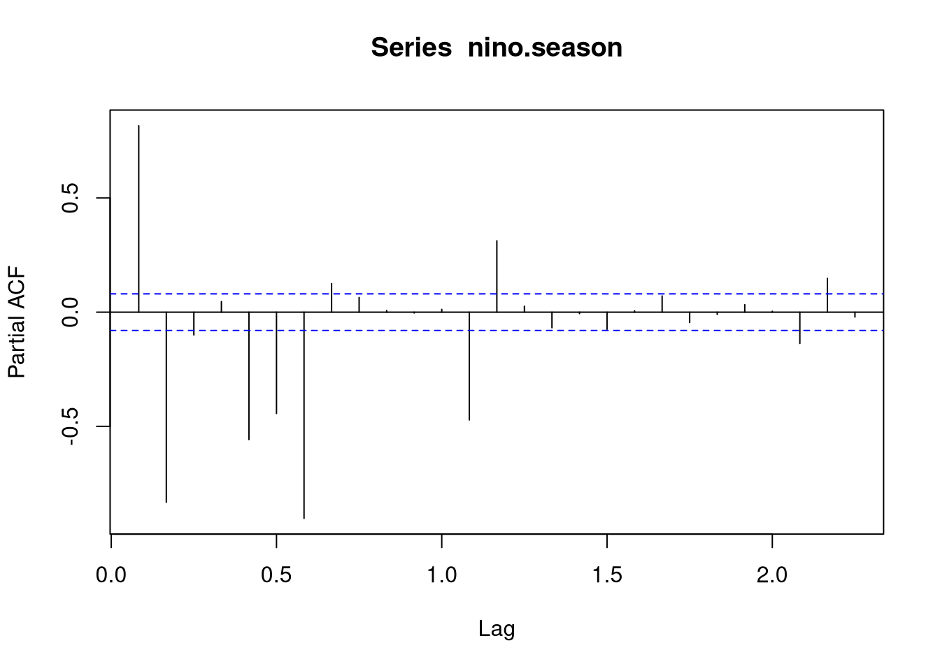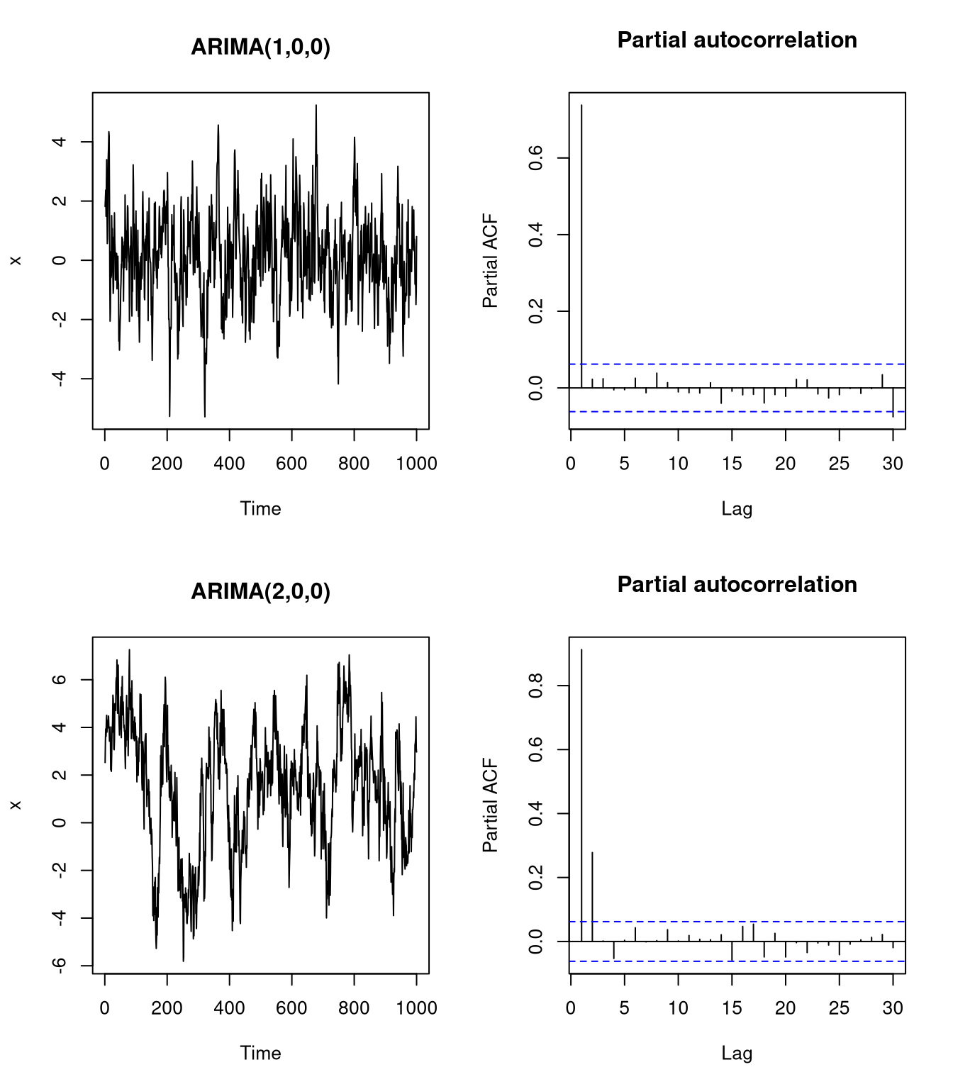 Since the autocorrelation observed for greater lags can be the results of correlations at lower lags, it is often worthwhile to consider partial autocorrelation function (pACF). The idea of the pACF is to compute partial correlations, which condition the correlation on more recent observations of the variable. The pACF is defined as:
