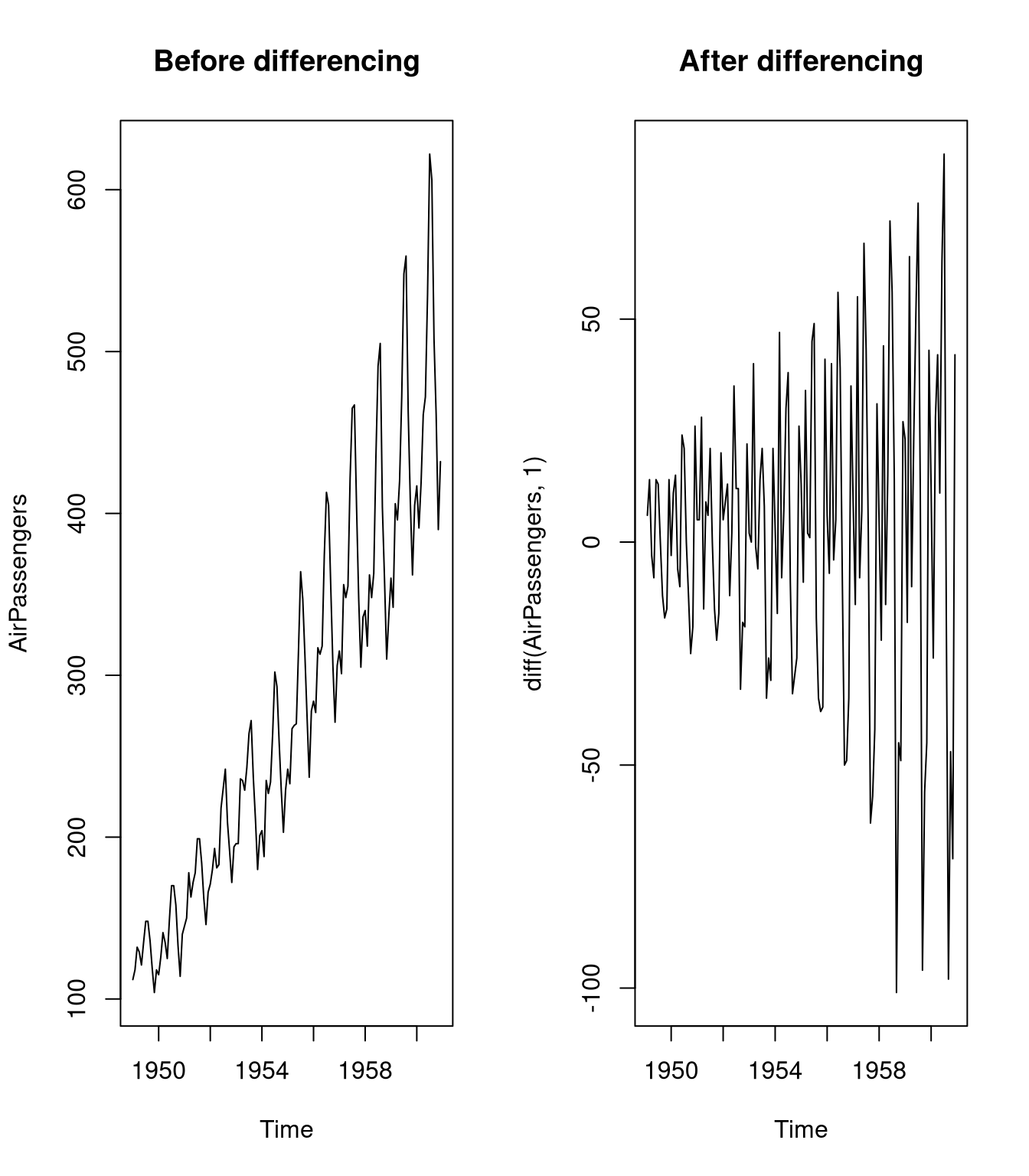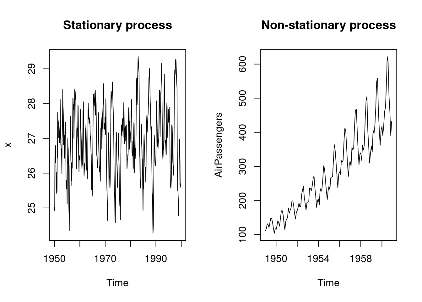 A process generating time-series data can be either stationary or non-stationary. A process is stationary if its mean and variance are not shifting along the timeline. For example, the EuStockMarkets and the AirPassengers data are both non-stationary because there is an increasing trend in the data. For a better intuition for differentiating stationary and non-stationary processes, consider the following example: