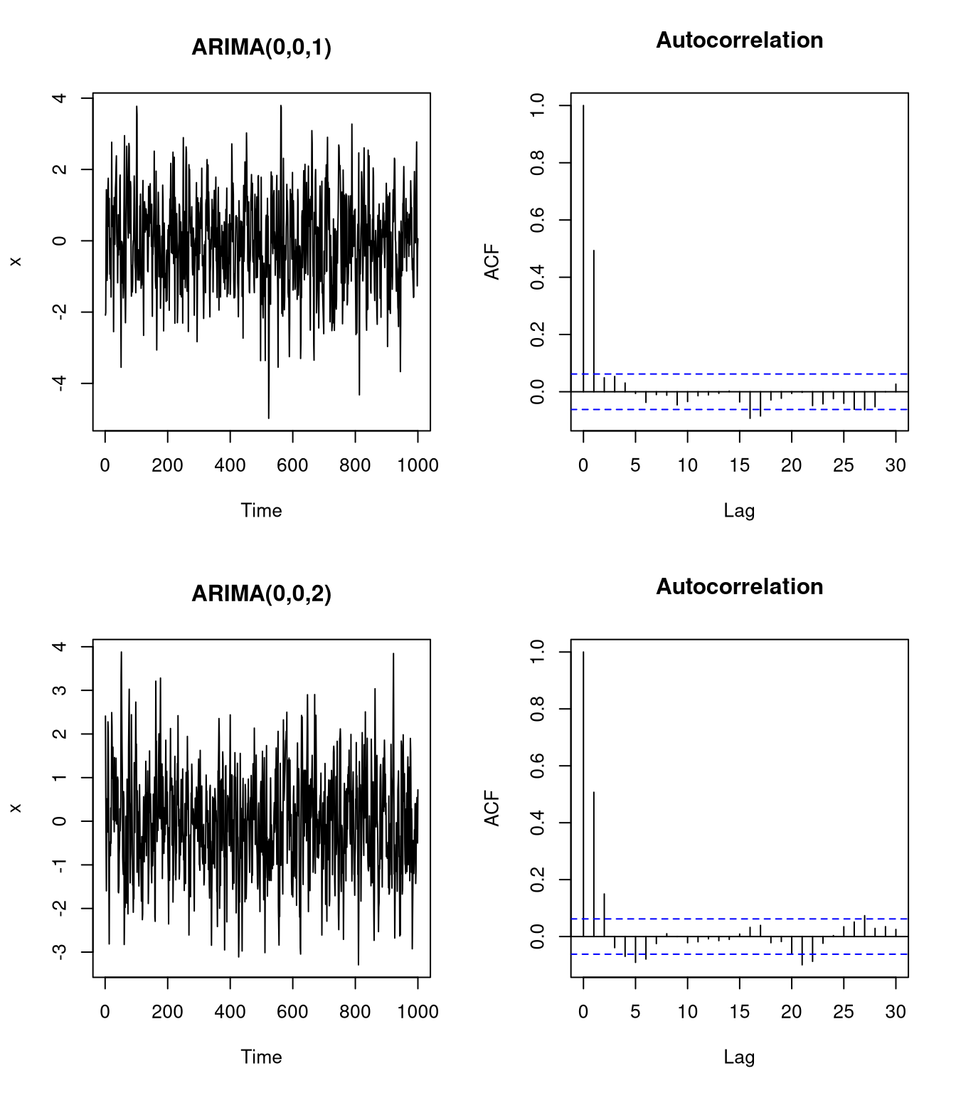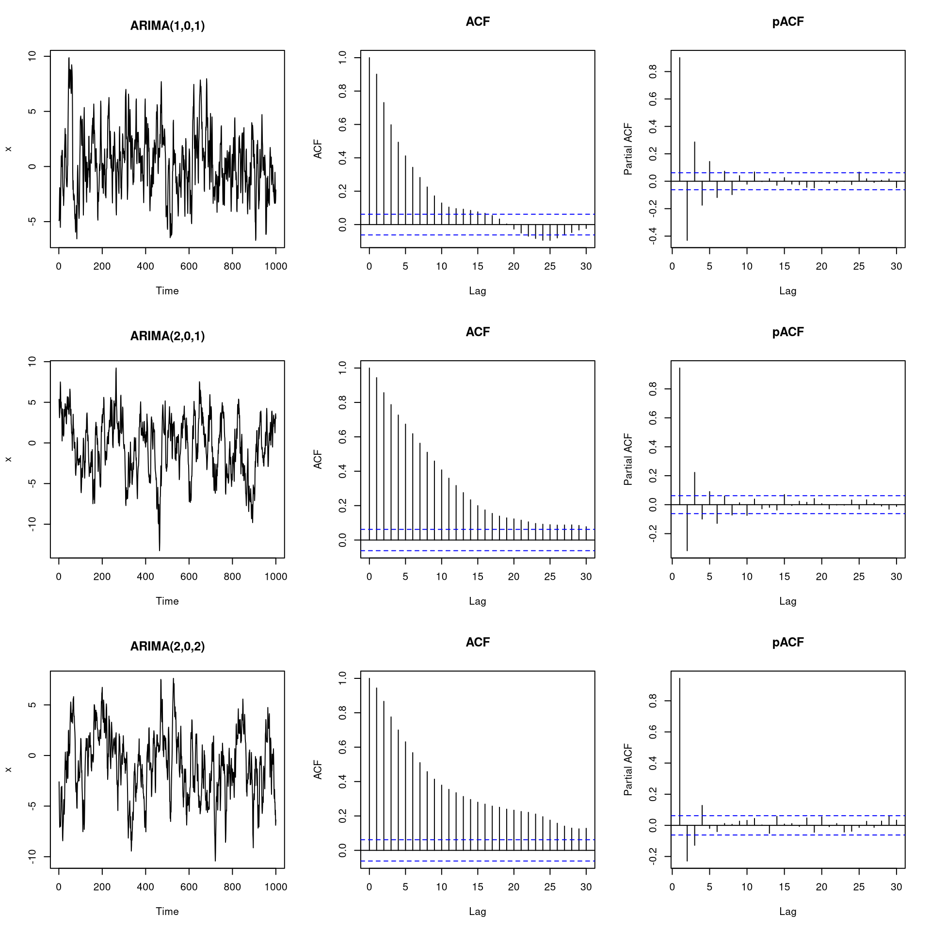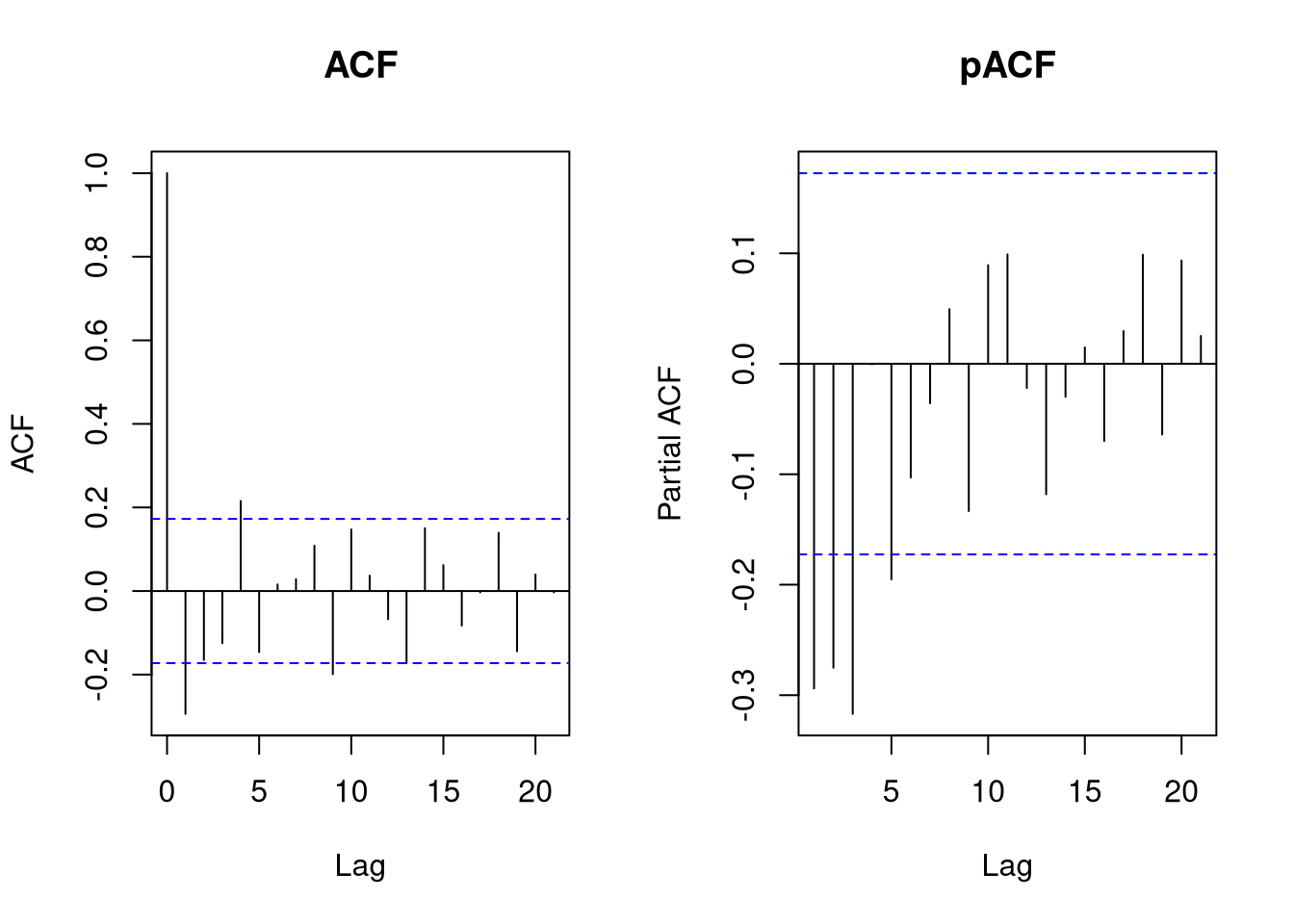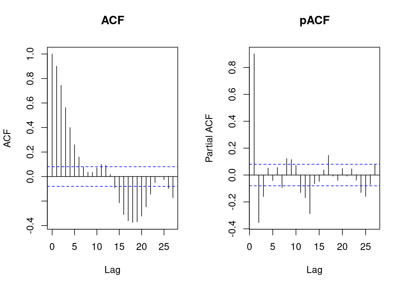 The simplest way to compute and plot the ACF and the pACF is the use of the acf and pacf functions, respectively: