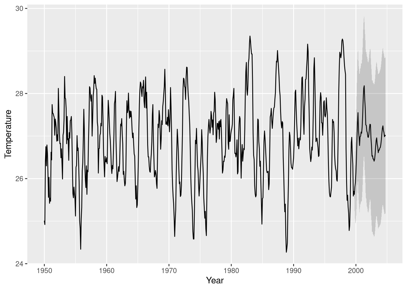 lines(window(ice.ts, c(1951, 22), c(1951, 30))) # actual values in black