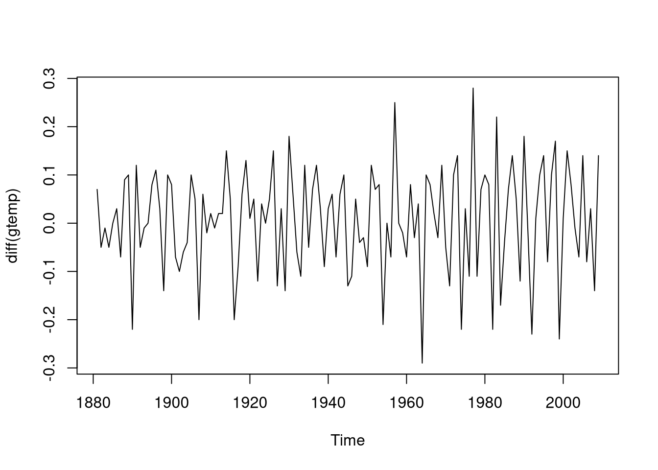 Using R, we can calculate lagged differences using the diff function. The second argument of the function indicates the desired lag, \(k\), which is set to \(k = 1\) by default. For example: