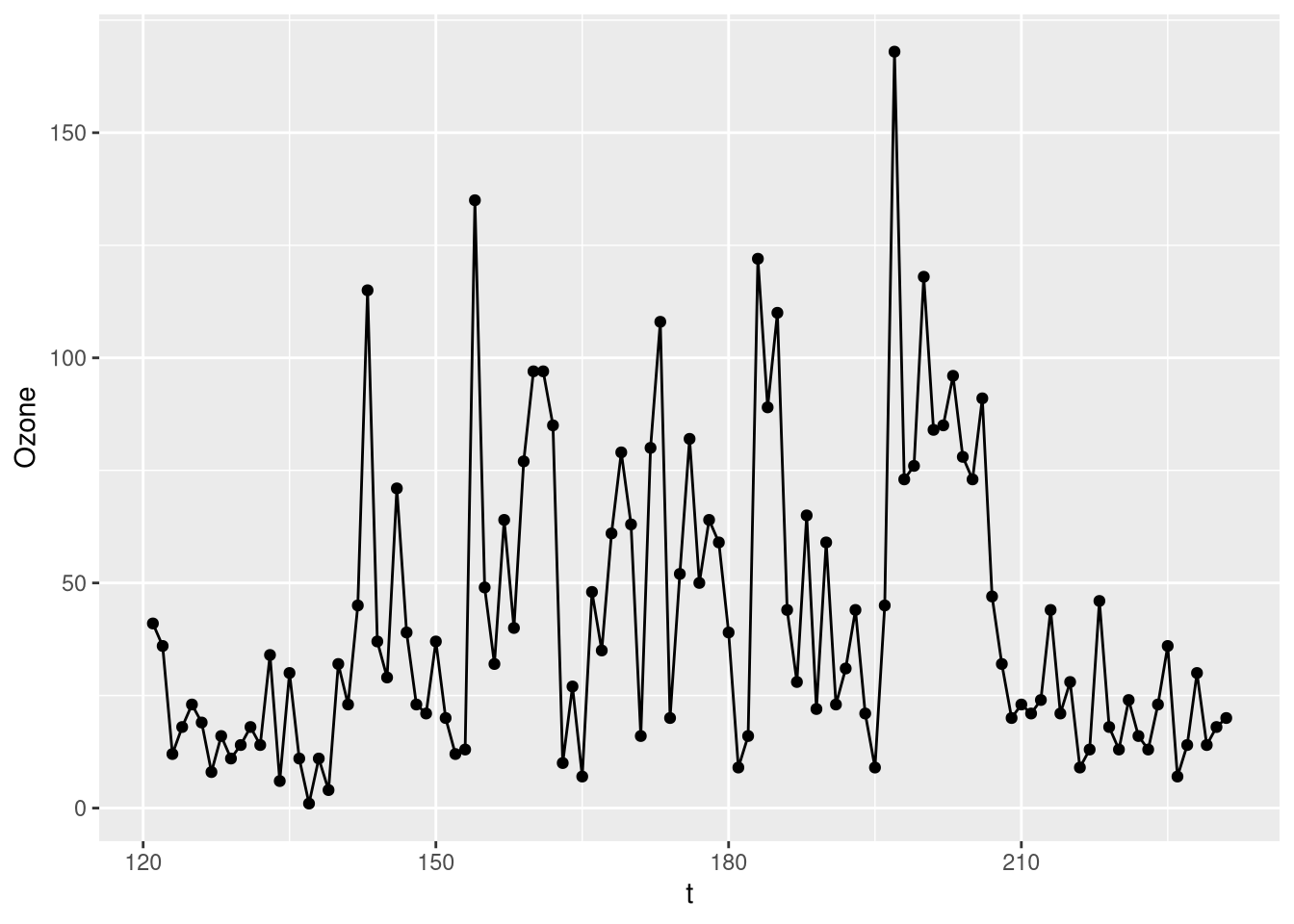 ggplot(ozone, aes(x = t, y = Ozone)) + geom_line() +