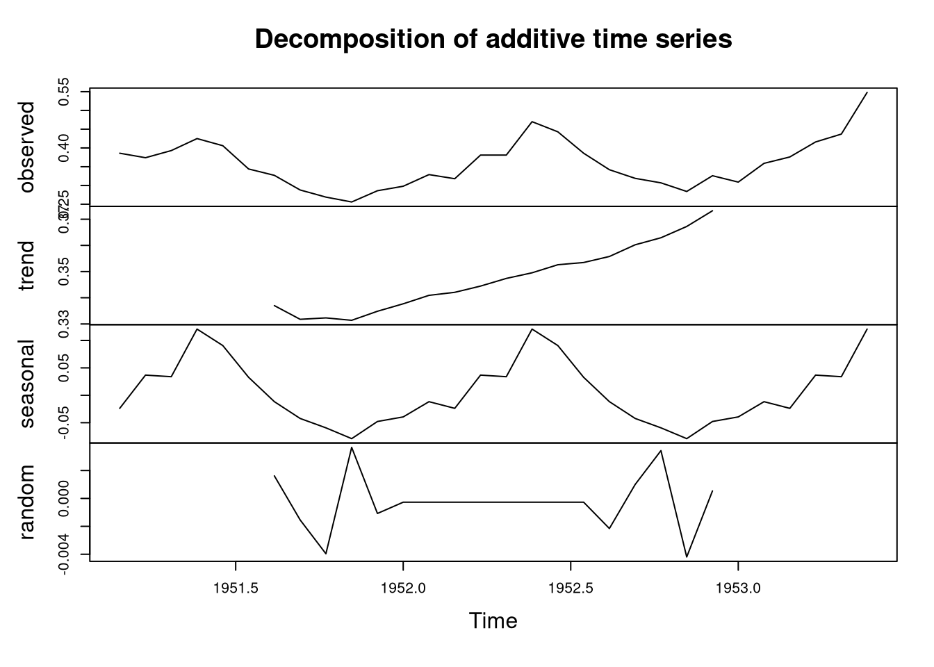 To decompose time-series data in R, we can use the decompose function. Note that we should provide whether the time series is additive or multiplicative via the type argument.