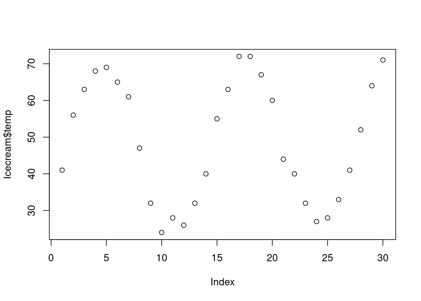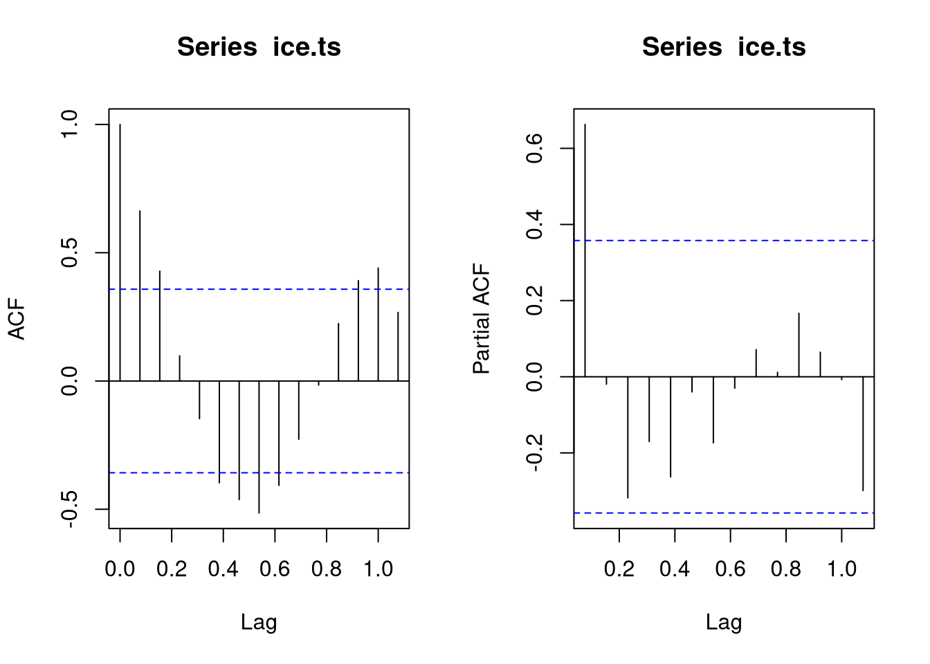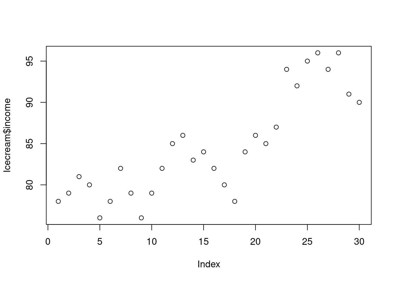 To demonstrate an ARIMAX model on a better suited set of data, let us load the Icecream data set from the Ecdat package: