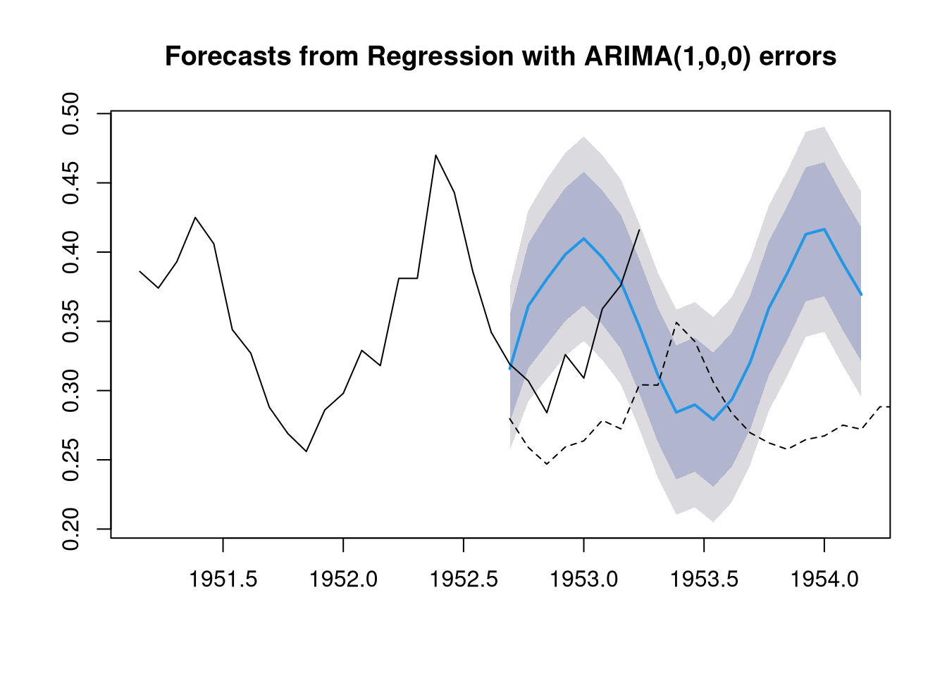 The forecast of the ARIMAX(1,0,0) model is shown in blue, while the forecast of the ARIMA(1,0,0)(1,0,0) model is shown as a dashed line. The actual observed values are shown as a black line. The results suggest that the ARIMAX(1,0,0) is decidedly more accurate than the ARIMA(1,0,0)(1,0,0) model.