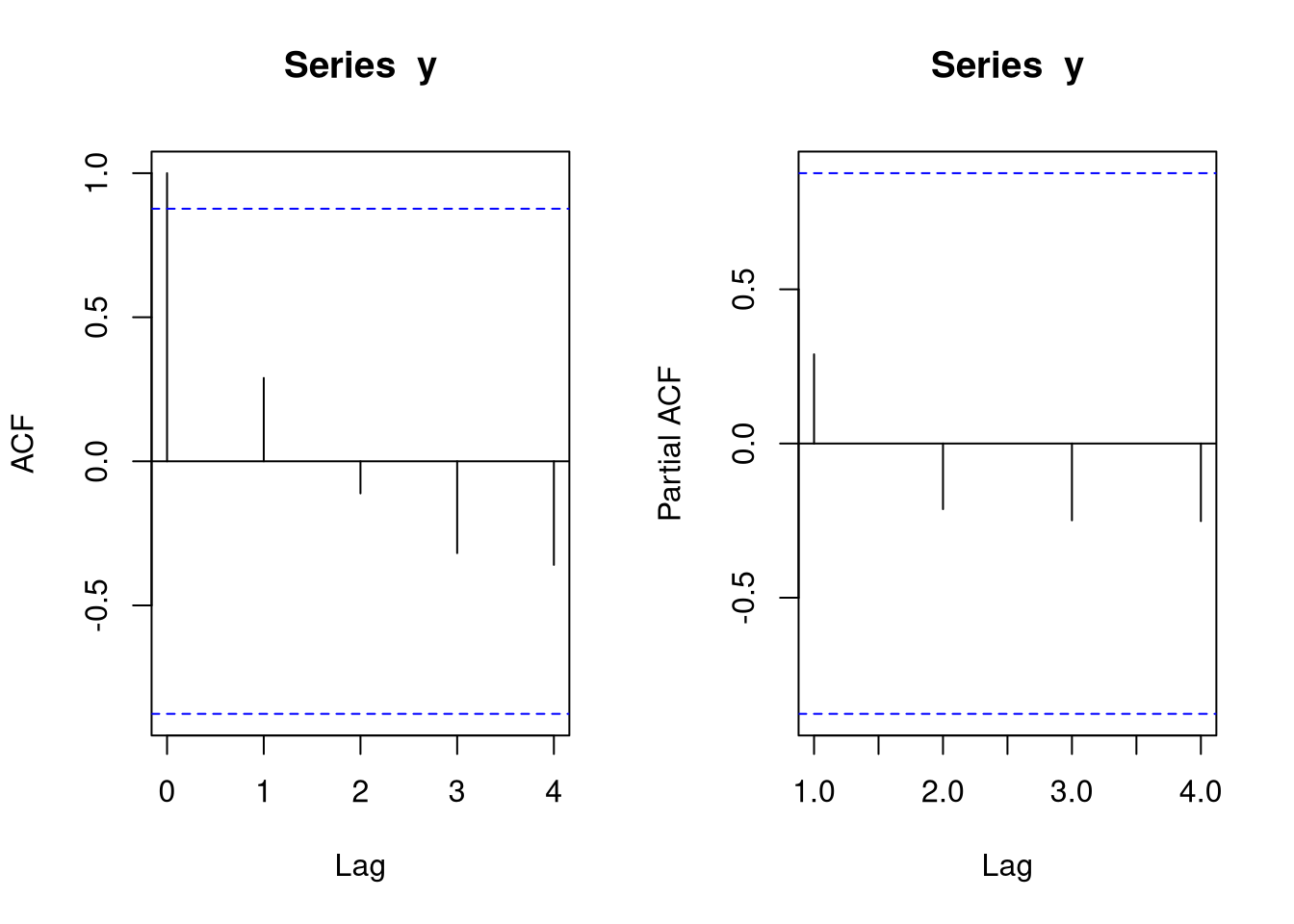 The function simply constructs the two vectors, \(y_t\) and \(y_{t-k}\) according to the lag parameter and then calculates their correlation. When we apply this example to our example, we receive the following results: