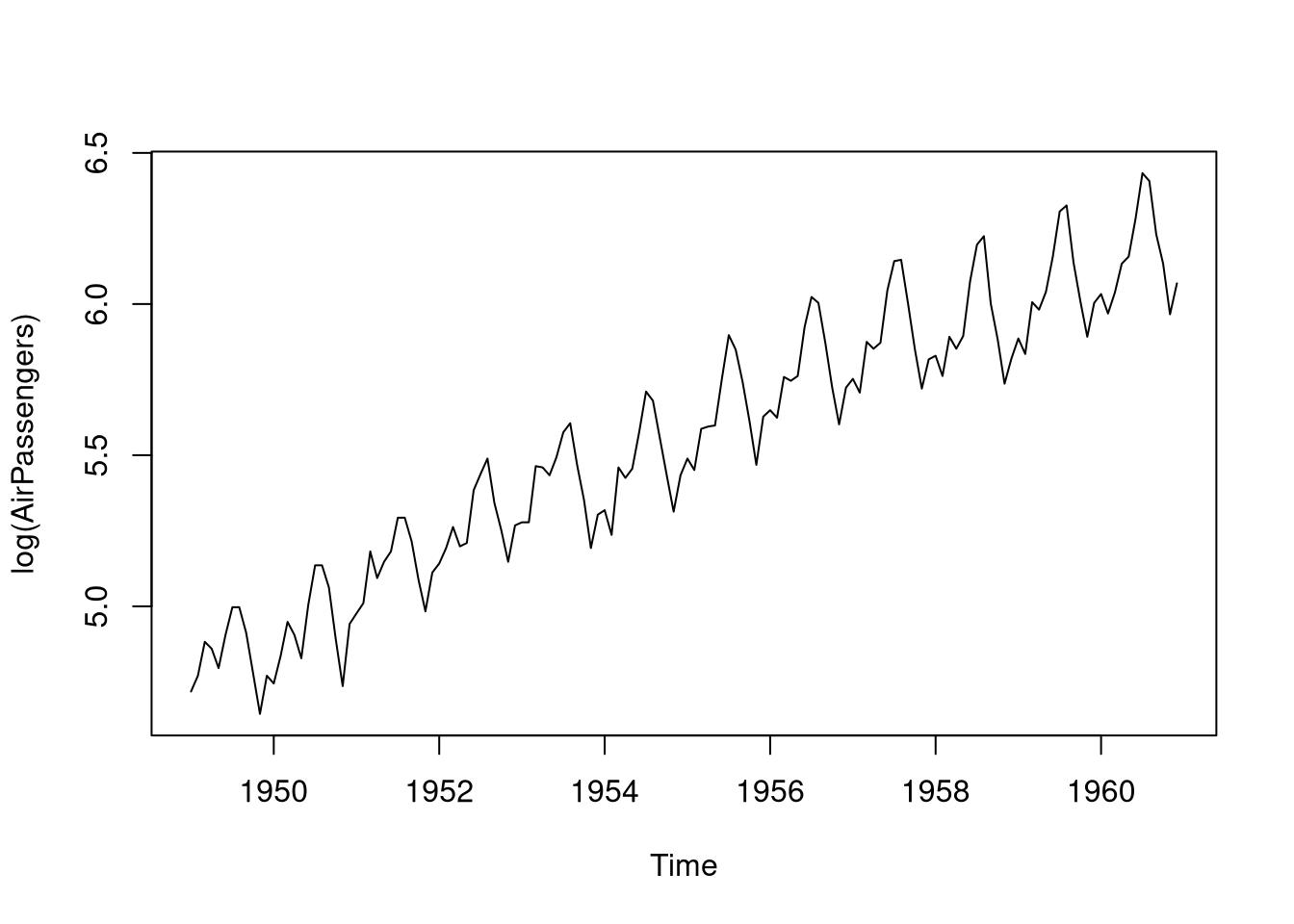 As we can see, the effect of the seasonal trend is increasing through the years (i.e. more airplane passengers in the summer), which indicates that this data is multiplicative. To adjust for this effect, we have to take the logarithm of the measurements when modeling this data because \(\log(S_t T_t \epsilon_t) = \log(S_t) + \log(T_t) + \log(\epsilon_t)\) turns the previously multiplicative model into an additive model. Let us verify whether taking the logarithm changes the seasonal trend in the AirPassengers data set: