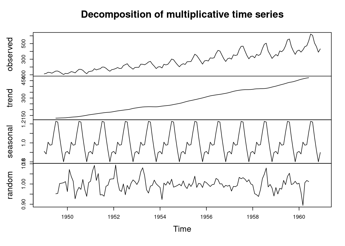 For the AirPassengers data set, we specify that the data are multiplicative and obtain the following decomposition: