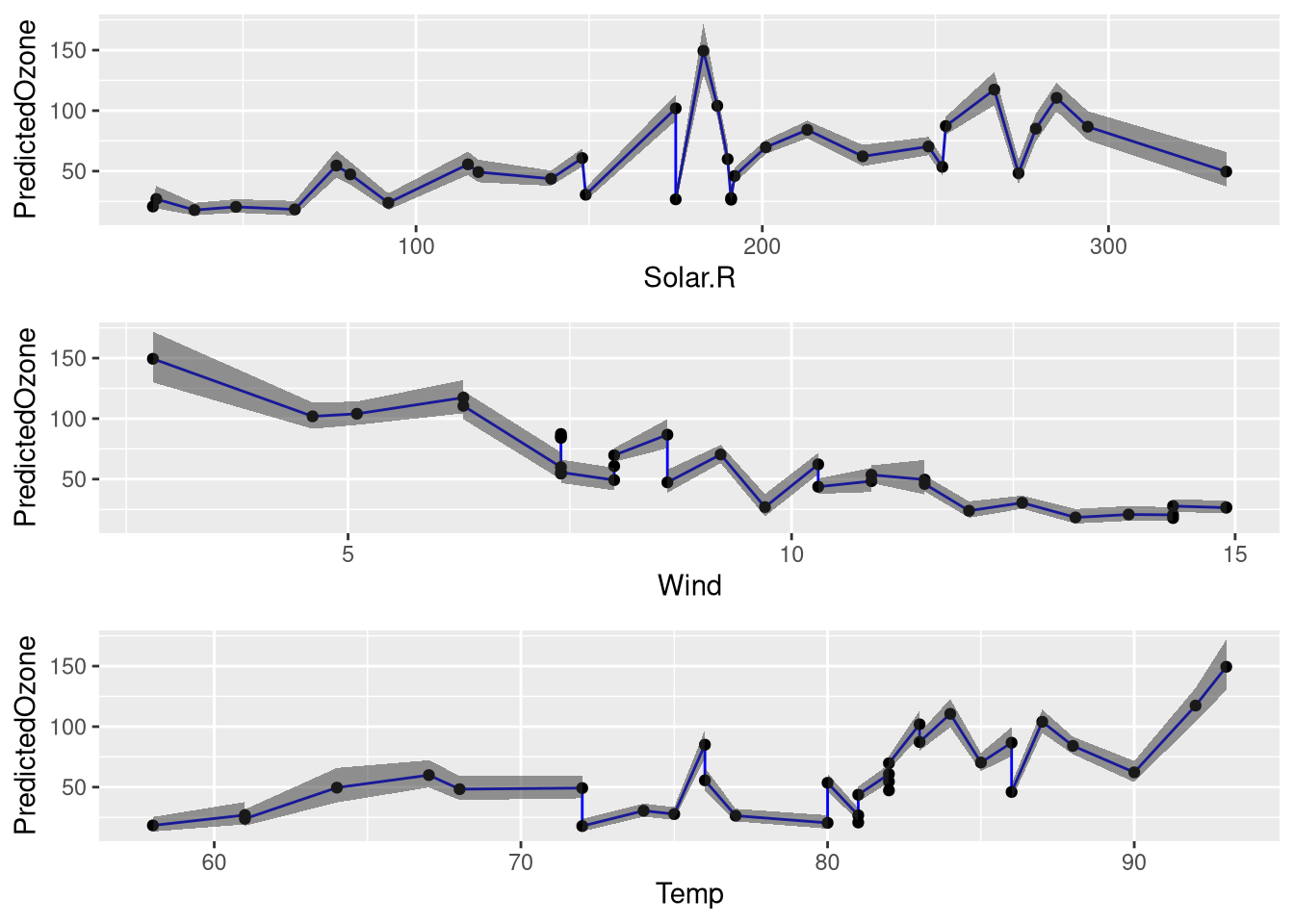 WindandTemperature. Estimated ozone levels drop whenWindincreases, while estimated ozone levels increase whenTempincreases. - The model is most confident for low ozone levels but less confident for high ozone levels