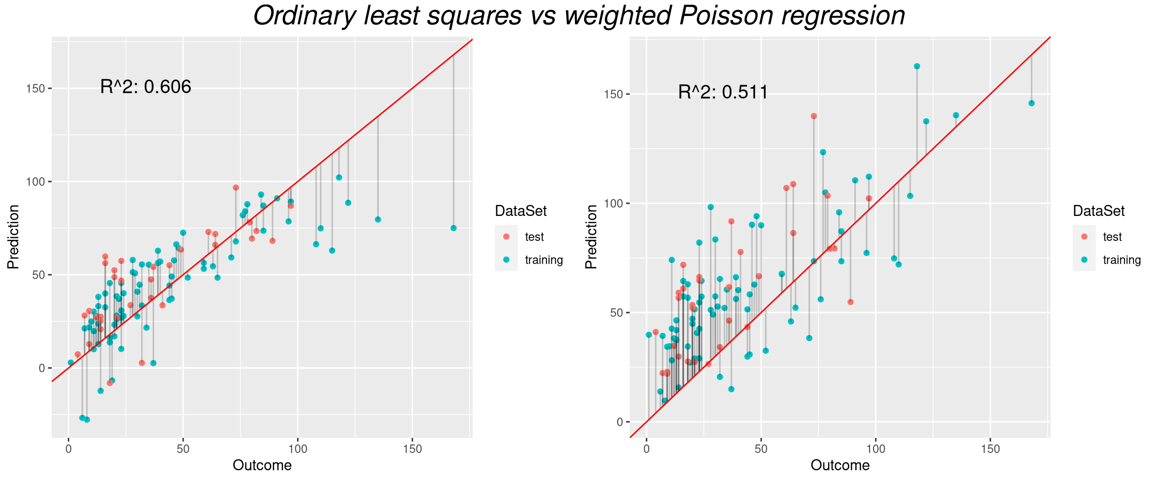 grid.arrange(p.OLS, p.w.pois, nrow = 1, top=textGrob("Ordinary least squares vs weighted Poisson regression",gp=gpar(fontsize=20,font=3)))