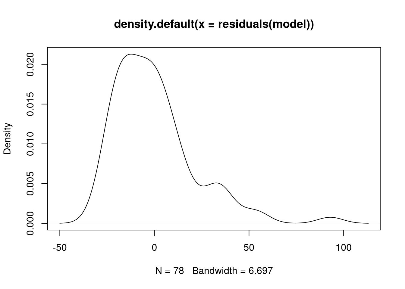 The histogram indicates that values at the right tail of the residual distribution are indeed problematic. Since the residuals are not really normally distributed, a linear model is not the best model. Indeed the residuals rather seem to follow some form of Poisson distribution. To find out why the fit of the least-squares model is so bad for the outliers, we take another look at the data.