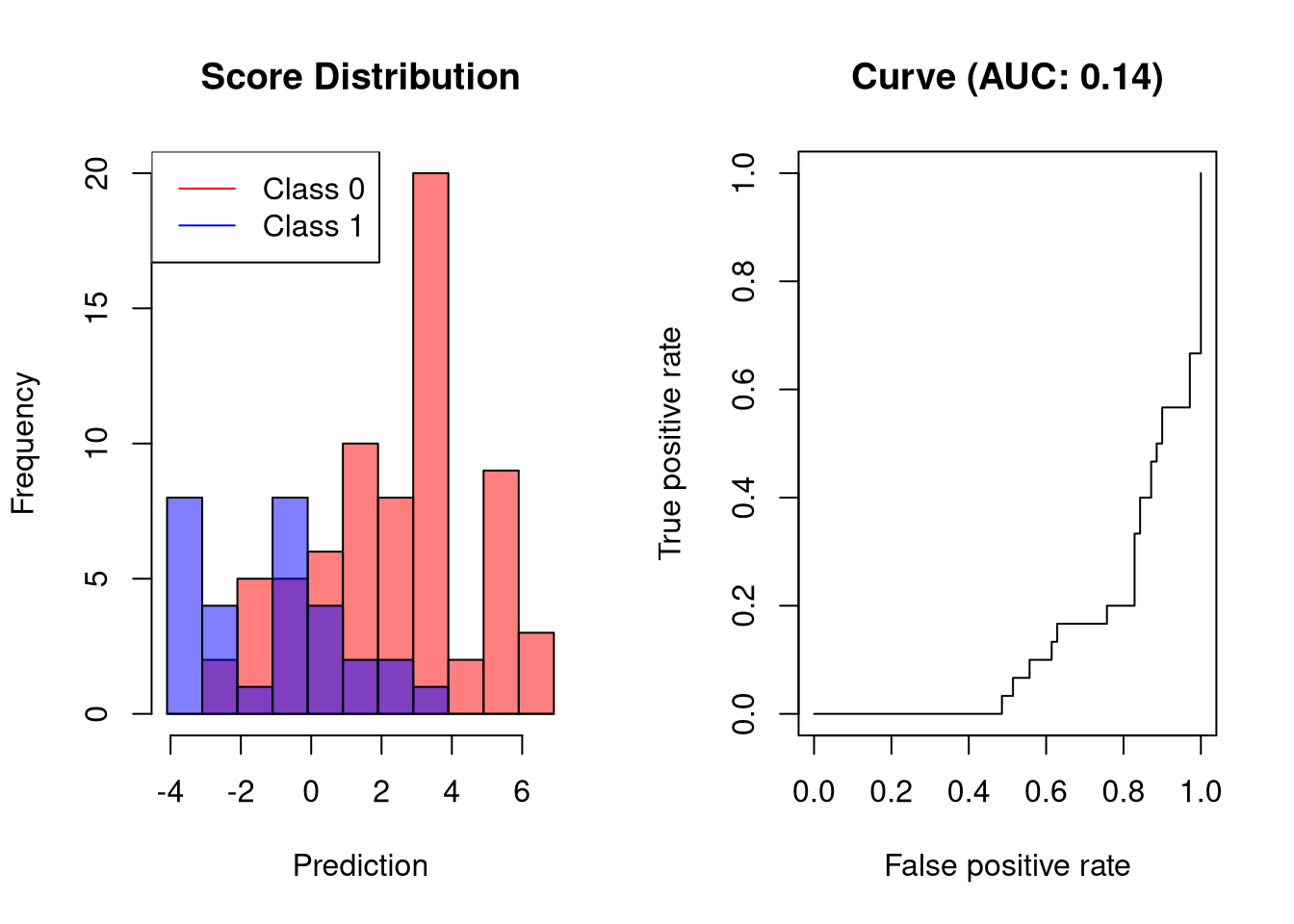 Usually, the AUC is in the range \([0.5, 1]\) because useful classifiers should perform better than random. In principle, however, the AUC can also be smaller than 0.5, which indicates that a classifier performs worse than a random classifier. In our example, this would mean that negative values are predicted for the positive class and positive values for the negative class, which would not make much sense. Thus, AUCs lower than 0.5 typically indicate that something has gone wrong, for example, that the labels have been switched.