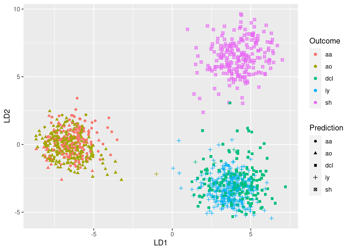 ggplot(plot.df, aes(x = LD1, y = LD2, color = Outcome, shape = Prediction)) +