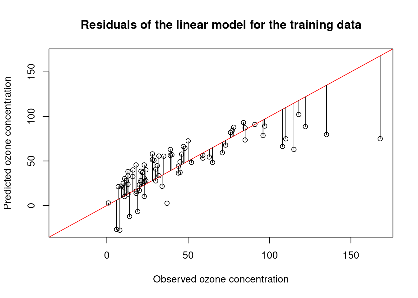 The residual median value suggest that the model generally predicts slightly higher values of ozone than observed. The large maximum value, however, indicates that some outlier predictions are also much too low. Looking at a numbers can be a bit abstract, so let us plot the predictions of the model against the observed values: