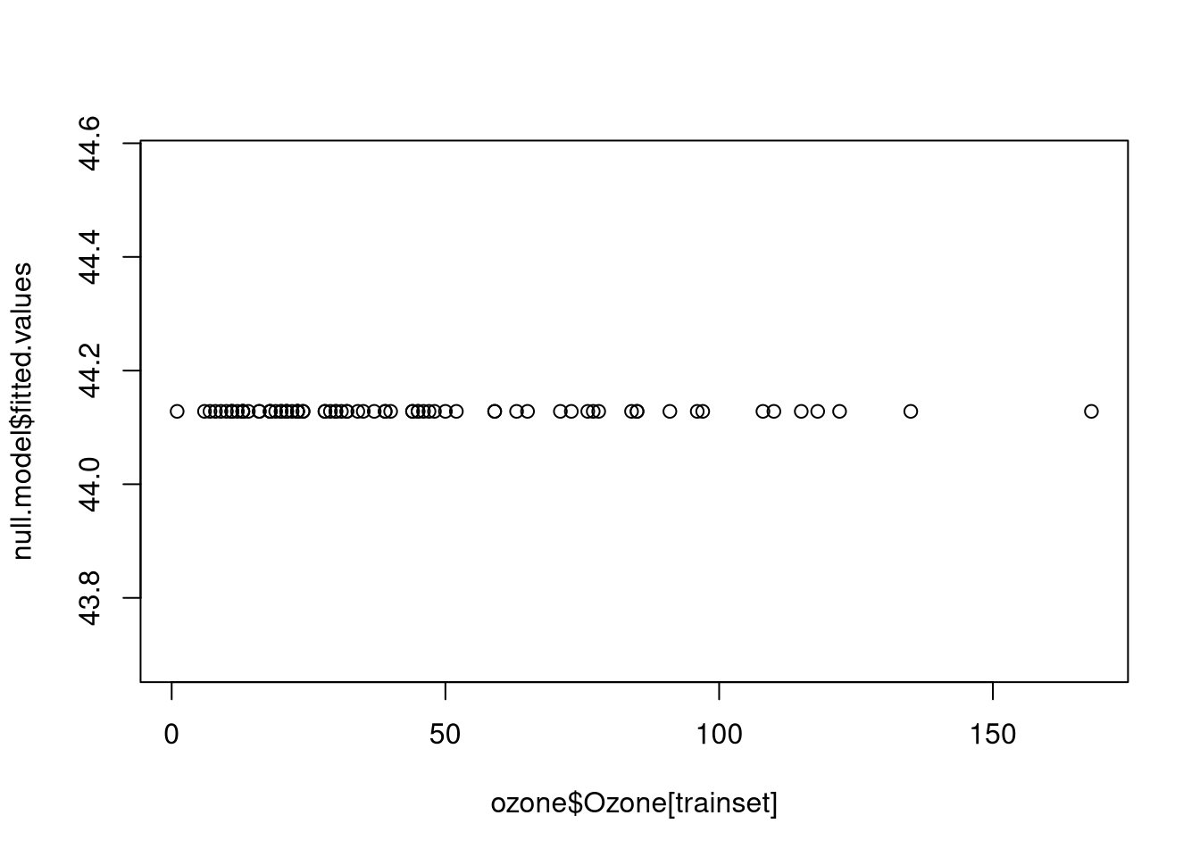 null.model <- lm(formula = Ozone ~ 1, ozone, trainset)