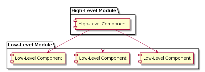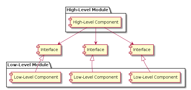 Here, the high-level module depends directly on low-level components. This means that there is strong coupling, with all its disadvantages. Applying the dependency-inversion principle, we would obtain the following dependency structure: