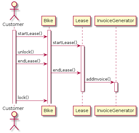 The idea is that the lease class is used to register/deregister the customer that is leasing a bike. Since every lease should result in an invoice, the lease class contains an InvoiceGenerator object, which performs all accounting tasks. The InvoiceGenerator can be written as follows: